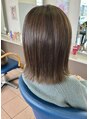 肩ラインの切りっぱなしボブをベースに全体の量感を減らしてシルエットを整えています。カラーは赤味を抑え透明感を出したオリーブベージュカラーです。
