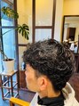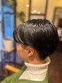前髪を少し長めに残し、センターパートに。、サイドに隠しツーブロックを入れたスタイル。