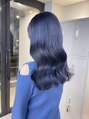 ブリーチ2回でつくるネイビーカラー。色落ちが緑にならないように、紫も混ぜて退色を調整しています!