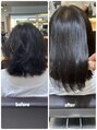 一年ぶりのご来店。クせにチリ付きが出て以前より髪が広がってまとまりにくい状態です。髪も強くクセも強いのでアルカリ矯正でしたいとこですがご本人様髪を柔らかくみせたいご要望でしたので賛成でチャレンジ。還元力上げ水抜きアイロンで理想の艶髪に。