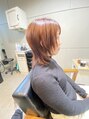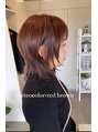 カラーはレッドブラウンでメテオカラーで染めました。カットは毛量が気になるのでくびれのある、ウルフレイヤーで、クセの少ない方はセットがしやすいスタイルです。