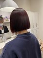 流行りの切りっぱなしボブスタイルに韓国風ワインレッド。ぱつっとしたカットラインがかわいい!広がりが気になる方、毎日のアイロンに疲れてしまった方はストレートパーマがオススメです。ブリーチなしでも赤系の色は再現できます!