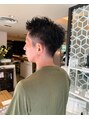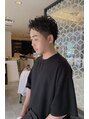 襟足を少し残し気味のミニウルフに程よい強さのツイストスパイラルパーマを施したスタイル。柔らかめのグリース仕上げ。全体的に髪の長さがある程度必要なスタイルです。してみたいけど、長さ足りるか分からない方は一度ご相談ください。