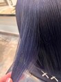 ブリーチを活かしてブルーバイオレットグレーを入れ派手すぎない色合いです。暗めに入れることで色鮮やかにそして色もちと色落ちを綺麗に!カットはプツンと切りっぱなしボブアイロンを入れるだけでプツンとラインが可愛いです!