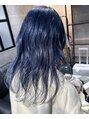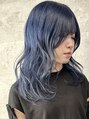 中間~毛先に縮毛矯正と暗染め履歴あり。ケアブリーチと脱染剤でベースを整え、紫をほんのり足した青色を。ブリーチベースは2回(髪質・施術履歴により異なります)ブリーチレベルが足りないと暗めのネイビー系になります