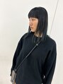 鎖骨くらい長さののロブにフルバングの重め前髪を合わせたスタイル。黒髪に毛先ブリーチ×2カラー×1のネイビーを合わせたクールなカラースタイル