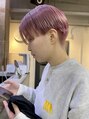 2ブリーチベースのピンクカラー。ハイトーンのピンクでも甘くなり過ぎないように少しマットなピンクカラー。カットはパツン刈り上げショート。