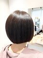 ライン感のある前上がりボブスタイル。赤みを抑えた質感のあるカラーで重く見えない仕上がりに◎