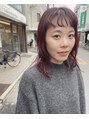 パーマとオン眉、パキッとしたピンクカラーのミディアムスタイルの組み合わせです!