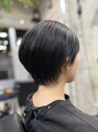 ブルーブラックカラーに前髪にワンポイントのデザインカラー。ショートボブスタイルでとメリハリのあるスタイルに。