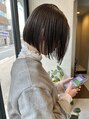 襟足ギリギリの切りっぱなしボブに暗めのグレージュカラー、少し前下がりにして大人ボブの定番スタイルにしました。色が抜けても綺麗に色落ちするのがポイント。ぱつっとボブがオシャレ!