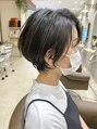 前髪を長めに残した大人ショート。地毛の黒髪を活かしたまま10レベルのナチュラルベージュで細かくハイライトを入れてあるので、シンプルなデザインながら毛流れと奥行き感がでます。