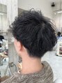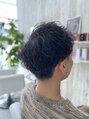 メンズパーマです。元々のくせをいかしながら大きめのスパイラルパーマをかけました。カラーはブルーブラックにしています。