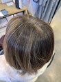 脱白髪染めに向けて、第一歩です。極細のハイライトと根本はお洒落染めを使ってのリタッチ。全体が黄色くなっていたので色味を抑えました。
