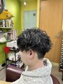 2ブロックマッシュショートに大きめのSカールで立体感のあるパーマスタイル。トップから表情が出るようにオーバーセクションにレイヤーを。カールにしっかりと面のある動きを出したいので、あえてツイストはせずにスパイラルパーマで巻いています。