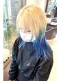 ブリーチ後カラーミューズブルー、ムラサキ、ホワイトを淡い色から濃い色になる様グラデーションをつけながら塗布しました。ベースはカラーマスクホワイトを使用しました。