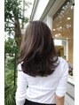 重ためのシルエットのミディアムレイヤー。厚みを残したレイヤースタイルなので、ボリュームのある大ぶりなカールが品よく見え、大人女性におすすめなスタイルです。カラーはハイライトを忍ばせた透明感グレージュカラー。