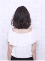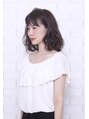 肩につくミディアムレングスに大きなウェーブをプラス。カットはワンレングスなのである程度広がりやすい髪質の方もタイトめに収まります。