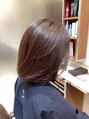 しばれるぐらいのレングスの前上がりのボブスタイルです。グラデーションが少しあって内巻きにしやすいです。カラーはベージュベースのナチュラルブラウンです。
