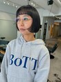 前上がりミニボブ。パツっとボブに顔周り少し前上がりに。前髪はオン眉ワイドバングで。前上がりのラインとオン眉ワイドバングで丸い印象を出してファッションや雰囲気に似合わせを。