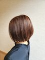 明るめな白髪染めでも自然に見えてツヤのあるブラウン!少し長めのショートボブにレイヤーを入れてトップもふんわりした質感に!