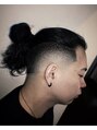 バーストフェード(耳周りに限定的に入れるフェード)で仕上げたマンバンスタイル。デザイン性のあるフェードでマンバンでイメージを変えてみましょう!ちょっとした刺激が欲しい方にもオススメです。