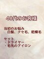 年齢からくる「頭皮臭」「枝毛・切れ毛」「乾燥毛」「ダメージ毛」を、オーダーメイド髪質改善『オージュア』、再現性&モチ抜群『似合わせカット』、透明感『イルミナカラー』、ツヤめく髪に『オーガニックカラー』、頭の温泉で癒す『頭浸浴』でお悩み解決♪