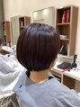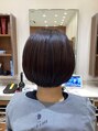 襟足ぎりぎりの真っ直ぐなローグラデーションボブスタイルです。ワンレングスより丸みがあるので綺麗に内巻きになりやすいです。上を向いても下を向いてもいつも綺麗なラインでいられます。カラーはベージュブラウンです。