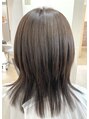 ミディアムウルフレイヤー。メテオトリートメントと同時施術の7トーン・ラテグレージュカラーで透明感あるなめらかな仕上がりに。