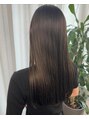ロングヘアのおしゃれなぱつっとライン♪トリートメントはもちろん、カラーに混ぜる栄養でツヤ感&色持ちUP間違いなし(^^)オリーブグレージュで赤味をしっかり消していくことでよりきれいな透明感が出せるようになりますよ♪