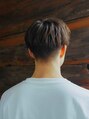 サイドツーブロック4ミリ、えりあし刈り上げのマッシュスタイルです。前髪は目の下くらいの長さで後ろのウエイトからやや前下がりのラインです。ワンカールのパーマをかけています。直毛の方やスタイリングを楽にしたい方におすすめスタイルです。