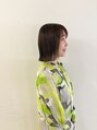 肩似つかないくらいのぱつっと切りっぱなしボブ全体をベージュ系カラー、インナーと表面に細めのハイライトブリーチを入れて立体感をだし、抜け感あるスタイルに