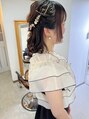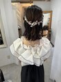 切りっぱなしボブのお呼ばれアレンジ。サイドの姫レイヤーをポイントに、ハーフアップでドレスに合わせた華やかなヘアアレンジにしました。