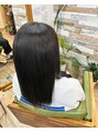 カット、ヴァリジョアカラー。毛先とボリュームのメンテナンスカットと、顔周りにレイヤーをインディゴ×チャコールグレーのミックスでトーンダウン暗くて涼しい色味に。ヴァリジョアTRで骨格構築×髪質矯正×水分保持しながらツヤツヤに。