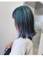 アンブレラブリーチ1回~。ブリーチした表面の髪にはカラーバターグリーンをオンカラー。内側はブラック。