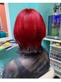 丸みのあるウルフに個性的なダークレッドに毛先黒ポイントでbraidsとクロスのアクセサリー