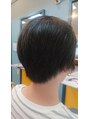 全体に毛量調節をして湿気でもボリュウームが出ないようにスッキリと収まるように仕上げました。フェイスラインは縦長のシルエットにしてあります。耳掛けスタイルにしてもいいですね。
