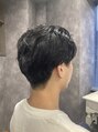 パーマ風のくせ毛を活かしたセンターパートスタイル。ベースにオイルをつけて、グリースで仕上げています。バランスを見て毛量を減らしています。