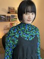 ワイドバングにステップカット、ショートボブ。ブルーパープルで暗く艶のあるカラーです。