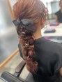 ロール編みっぽく何個に束ねた髪を、一個ずつゆるくほどいていきながら作ってます。真ん中には小さな丸いコサージュを作り、ゴム止めが見えないようにしてるので、ヘア飾りも可愛くフィットしてくれてます^_^