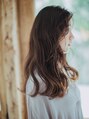 長めバングにレイヤーの入ったロングヘアスタイル。カラーは赤みの少ないブラウンカラーで透明感のあるカラーに。顔周りとサイドにレイヤーを入れることで巻いた時にうごきがでて、長くてのっぺりしがちなロングも動きのあるスタイルに。