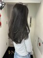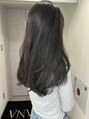 サイドに向かってたっぷり入ったレイヤーで毛先の動きを楽しむロングスタイル☆毛先に厚みを残す部分と軽さをだすレイヤーのバランス感、ゆるく大きなワンカールでトレンドレイヤーを楽しめます◎カラーはシアーなダークグレーで暗さの中に透け感を楽しめます