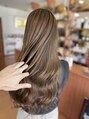 ブリーチなしデザインカラーのオリーブベージュロングヘアです。根元から毛先にかけてグラデーションにしています。