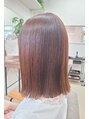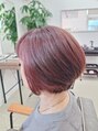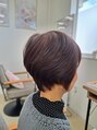 襟足は少し長め。トップとバックにボリュームが出るようにカット。ツヤ増しピンク系のカラー。丸みのあるショートスタイル。アイロンやカーラーなどでトップを巻いていただくと、よりボリュームが出やすくなります。