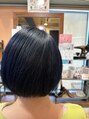 印象の固定観念を無くすためお顔にモザイク加工をしていますブリーチでベースを作ったあとに暗めのグレーとブルーをMIXさせたブルーブラックです♪