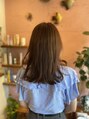 フェイスラインのみにやや存在感のあるレイヤーカットを入れた切りっぱなしボブ。透明感のあるアッシュブラウンのヘアカラー。.