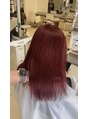 ブリーチ1回で出来る落ち着いたバーガンディ!ブリーチが初めての方でも挑戦しやすいカラーです!スタイルはミディアムスタイルにまとまりやすいようにグラデーションカットと巻いて動きをつけたい時の為にトップの軽いレイヤーが入っています!