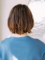 ボブベースの丸みのあるショートスタイルです。襟足は首に沿う様にすっきりと。バングは透け感を出して全体のシルエットが丸くなりすぎない様に調整しました。顔まわりも長く残しすぎずにエアリー感が可愛らしさをよりひきだします!