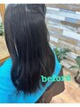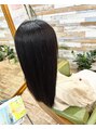 カット、ヴァリジョア縮毛矯正。毛先とボリュームのメンテナンスカット。髪質に合わせてアルカリと酸性のハイブリッドミックス。骨格構築(内部補修)、髪質矯正(結合強化)、水分保持(うるおい付与)しながら縮毛矯正。