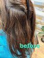カット、ヴァリジョア縮毛矯正、リタッチカラー。毛先のメンテナンスカット。髪質に合わせた酸性薬剤で髪の体力を維持した縮毛矯正。カラーのリタッチと縮毛矯正の2液を同時施術。